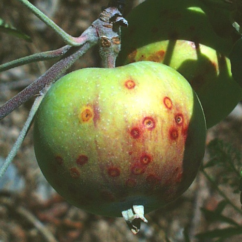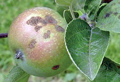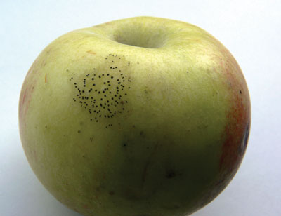 در تصویر بالا سمت راست لکه سیاه سیب، سمت چپ پایین فضله مگس و سمت چپ بالا لکه دوده ای نشان داده شده است.